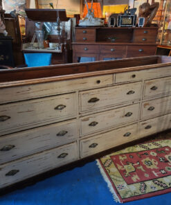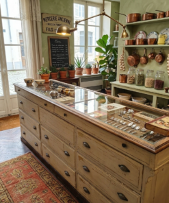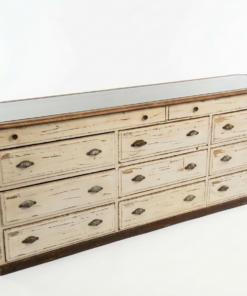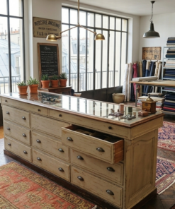 Ce type de meuble était la pièce maîtresse des anciennes boutiques de tissus, de rubans ou de mercerie. Contrairement à une commode classique, il est conçu pour être multifonctionnel : il sert à la fois de surface de présentation et de stockage massif.