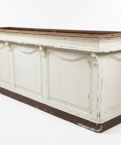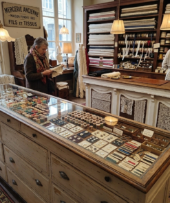 Ce meuble est une superbe pièce d’art populaire et de commerce : un comptoir de mercerie ancien (ou meuble de métier), probablement de la fin du XIXe ou du début du XXe siècle.
