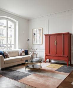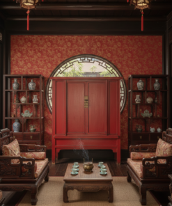 Couleur : Rouge laqué mat. Le rouge est symbolique dans la culture chinoise, représentant la chance, la joie et la prospérité.
