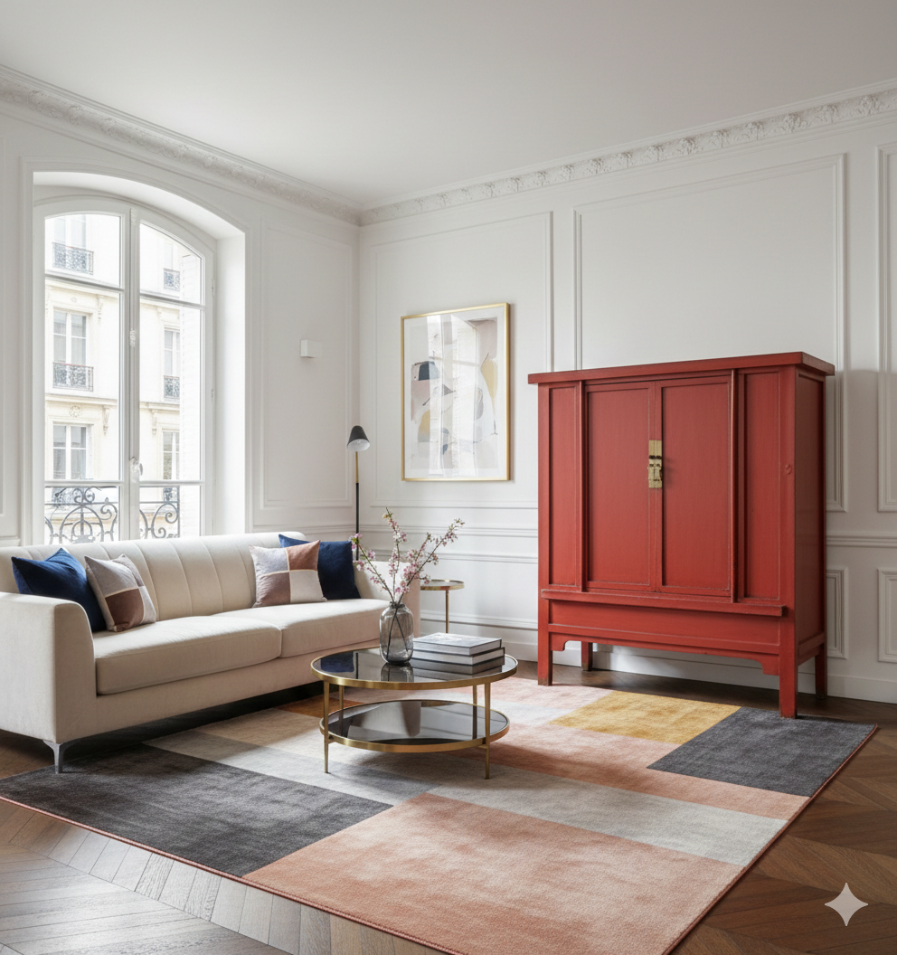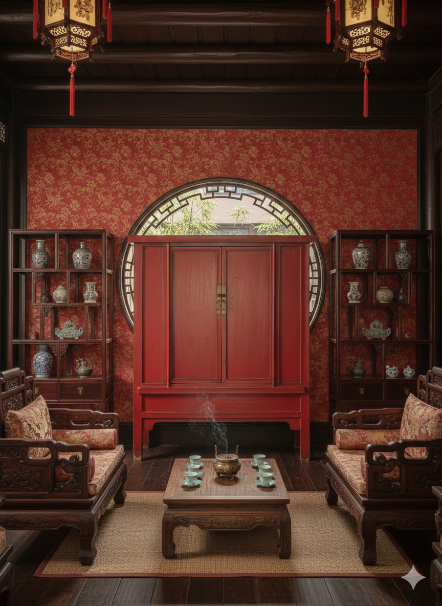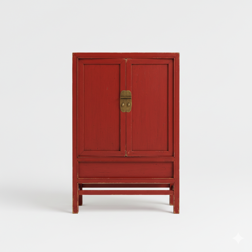 Couleur : Rouge laqué mat. Le rouge est symbolique dans la culture chinoise, représentant la chance, la joie et la prospérité.