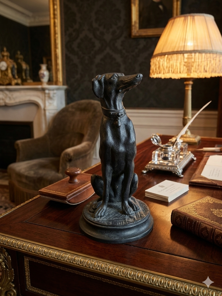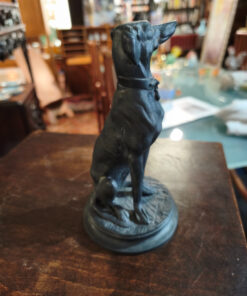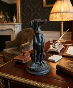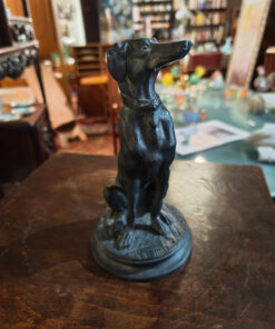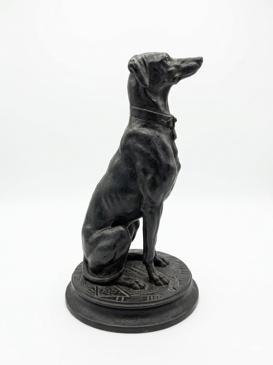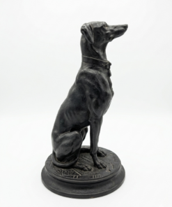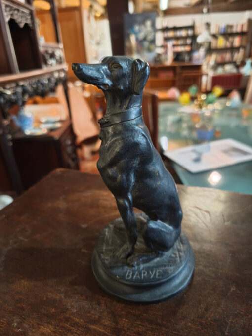 Le sujet représenté est un lévrier (probablement un Whippet ou un lévrier italien), un thème récurrent chez Barye qui appréciait la finesse anatomique et l’élégance de cette race. Contrairement à ses scènes de combat sauvage (lions contre serpents, etc.), cette œuvre dégage une grande sérénité et une vigilance silencieuse.