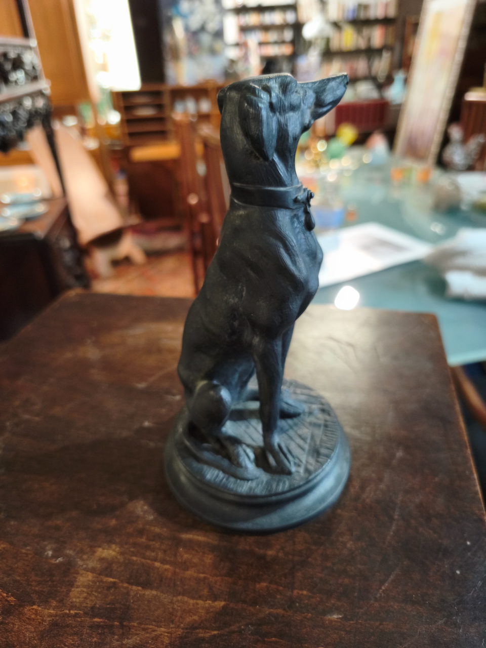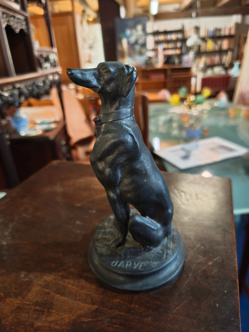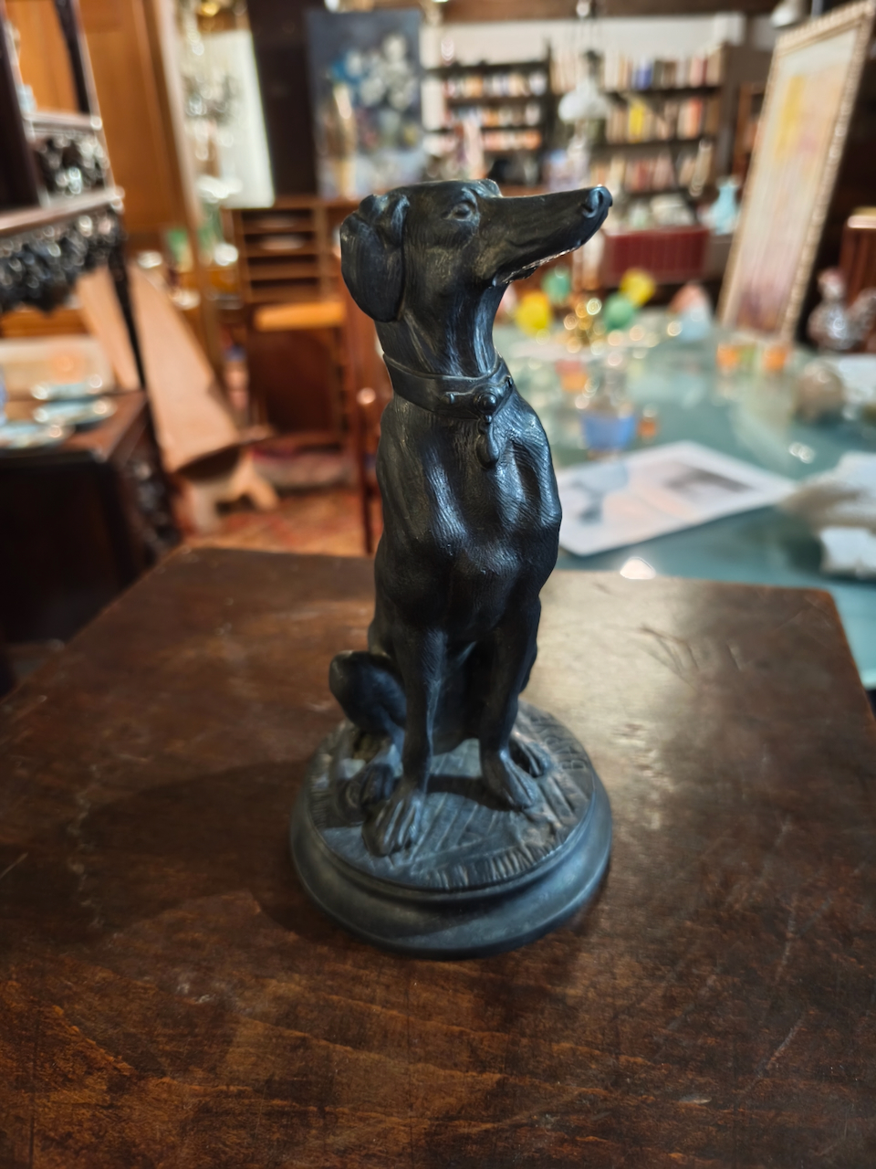 Le sujet représenté est un lévrier (probablement un Whippet ou un lévrier italien), un thème récurrent chez Barye qui appréciait la finesse anatomique et l’élégance de cette race. Contrairement à ses scènes de combat sauvage (lions contre serpents, etc.), cette œuvre dégage une grande sérénité et une vigilance silencieuse.