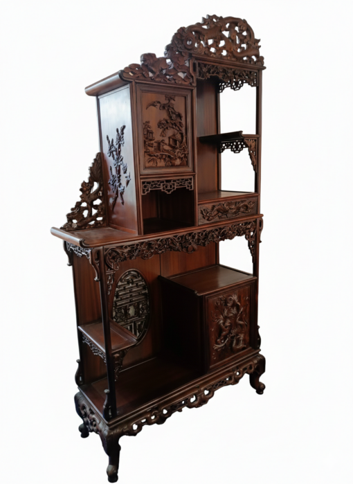Meuble de présentation en bois sculpté, décors de dragons, chauve souris, oiseaux et feuillages.