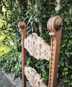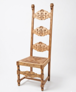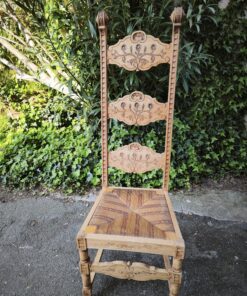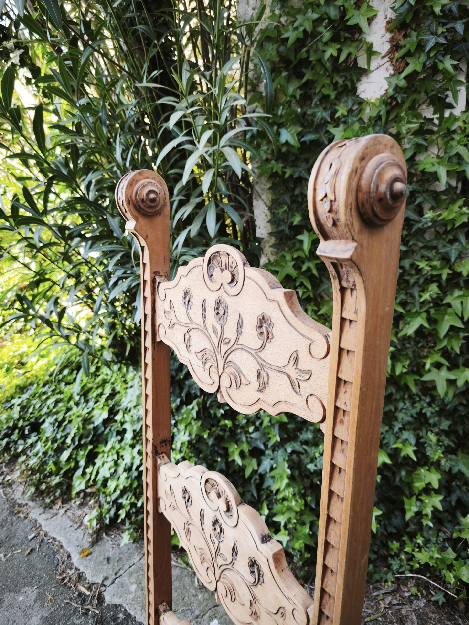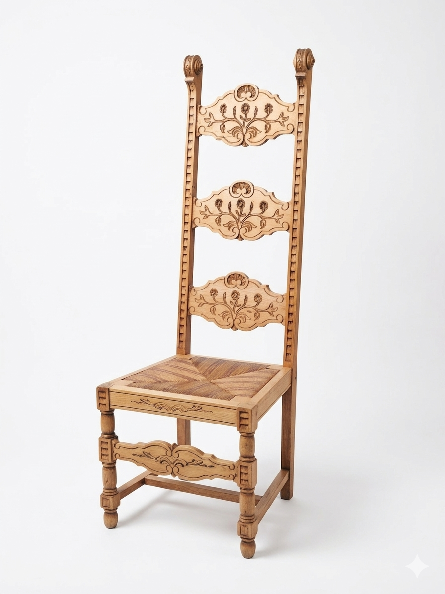 Le Dossier « Échelle » Monumental : Sa hauteur inhabituelle et ses montants verticaux crantés lui donnent une allure majestueuse. Les trois traverses horizontales sont richement sculptées de motifs floraux et végétaux symétriques.