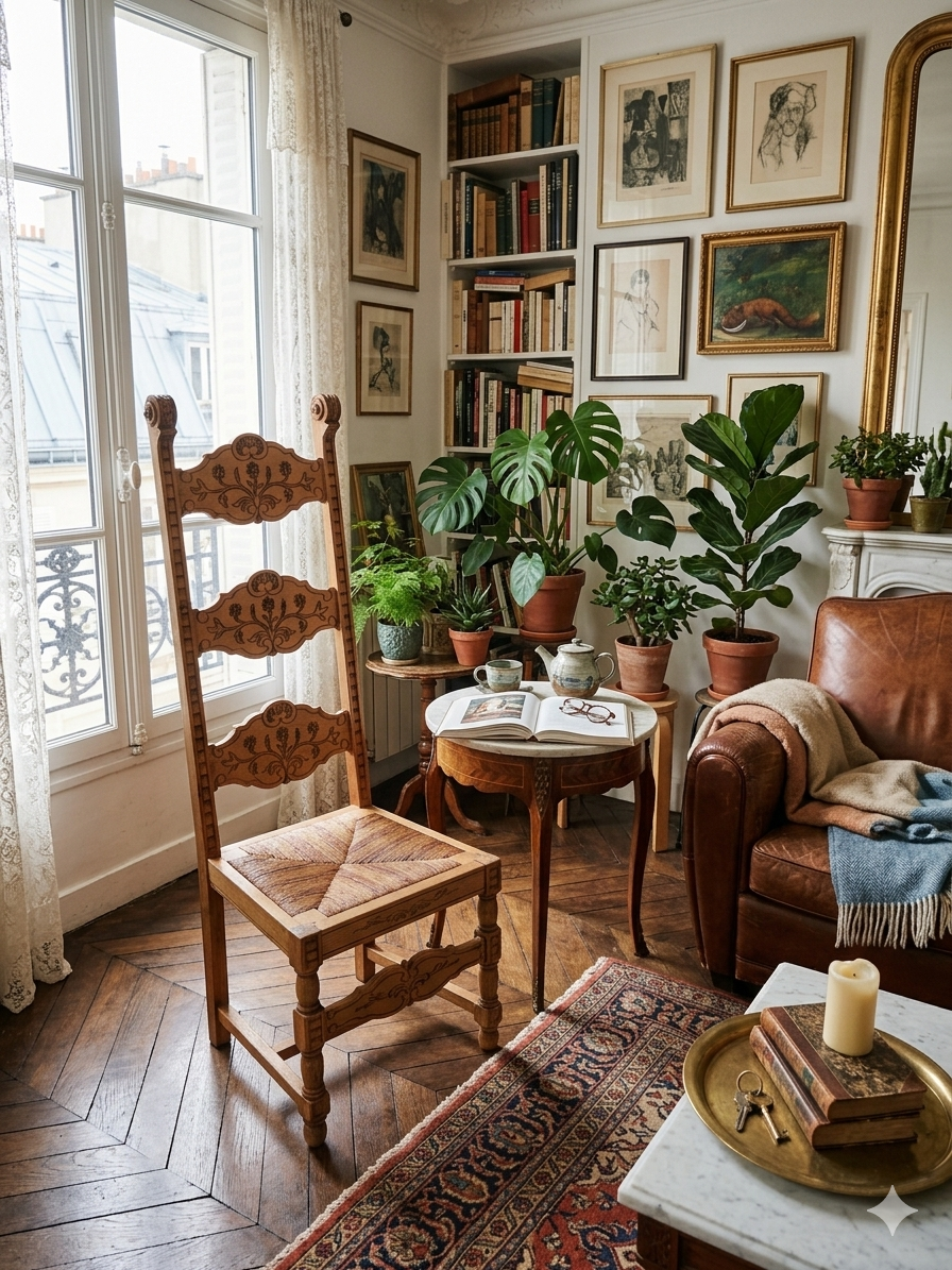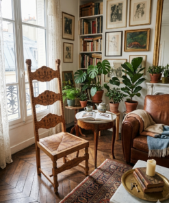 L’Assise en Paille : Le tressage en damier (souvent fait de paille de seigle ou de jonc) est typique du mobilier provençal ou espagnol. Il apporte une texture naturelle qui contraste avec la rigueur du bois.