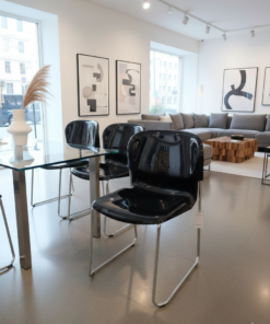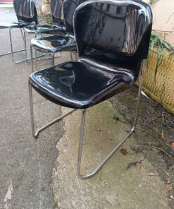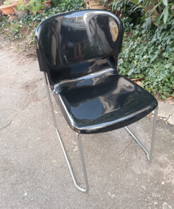 Matériaux : Coque d’assise monobloc en polypropylène, finition noire brillante et piétement « traîneau » en acier chromé.