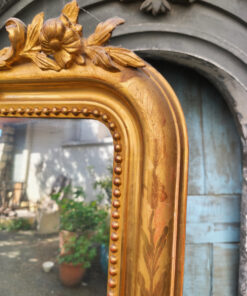 La pièce maîtresse est la coquille centrale, emblématique du style Louis XV. Elle est entourée de rinceaux d’acanthe et de guirlandes de fleurs finement sculptées qui s’étendent sur les épaules du miroir. Cette structure haute donne au miroir une présence très verticale et majestueuse.