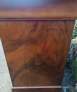 Le Placage : La façade est travaillée en placage de noyer. On remarque un soin particulier apporté à la disposition des veines du bois pour créer des motifs symétriques (placage en « ailes de papillon »).