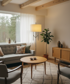 L’Abat-jour : Il s’agit ici d’un format tambour (cylindrique), généralement en tissu ou en toile de lin, qui diffuse une lumière chaleureuse contrastant avec la froideur élégante du métal.