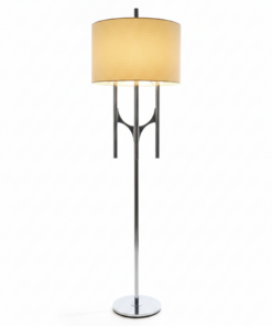 Design & Structure : Le lampadaire se compose de trois fûts cylindriques en métal chromé de hauteurs différentes. Ils s’élancent à partir d’un nœud central aux lignes courbes, créant une silhouette sculpturale et élancée.