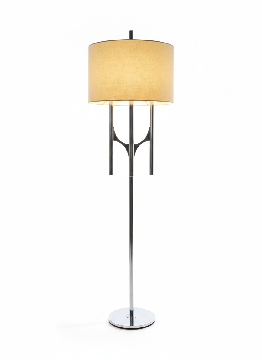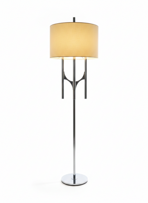 Design & Structure : Le lampadaire se compose de trois fûts cylindriques en métal chromé de hauteurs différentes. Ils s’élancent à partir d’un nœud central aux lignes courbes, créant une silhouette sculpturale et élancée.