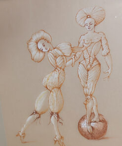 Sujet : On y voit deux figures androgynes ou féminines vêtues de costumes extrêmement travaillés qui rappellent à la fois des structures botaniques (comme des pétales ou des gousses) et l’anatomie musculaire. Cette fusion entre l’humain et le végétal est typique de son travail.