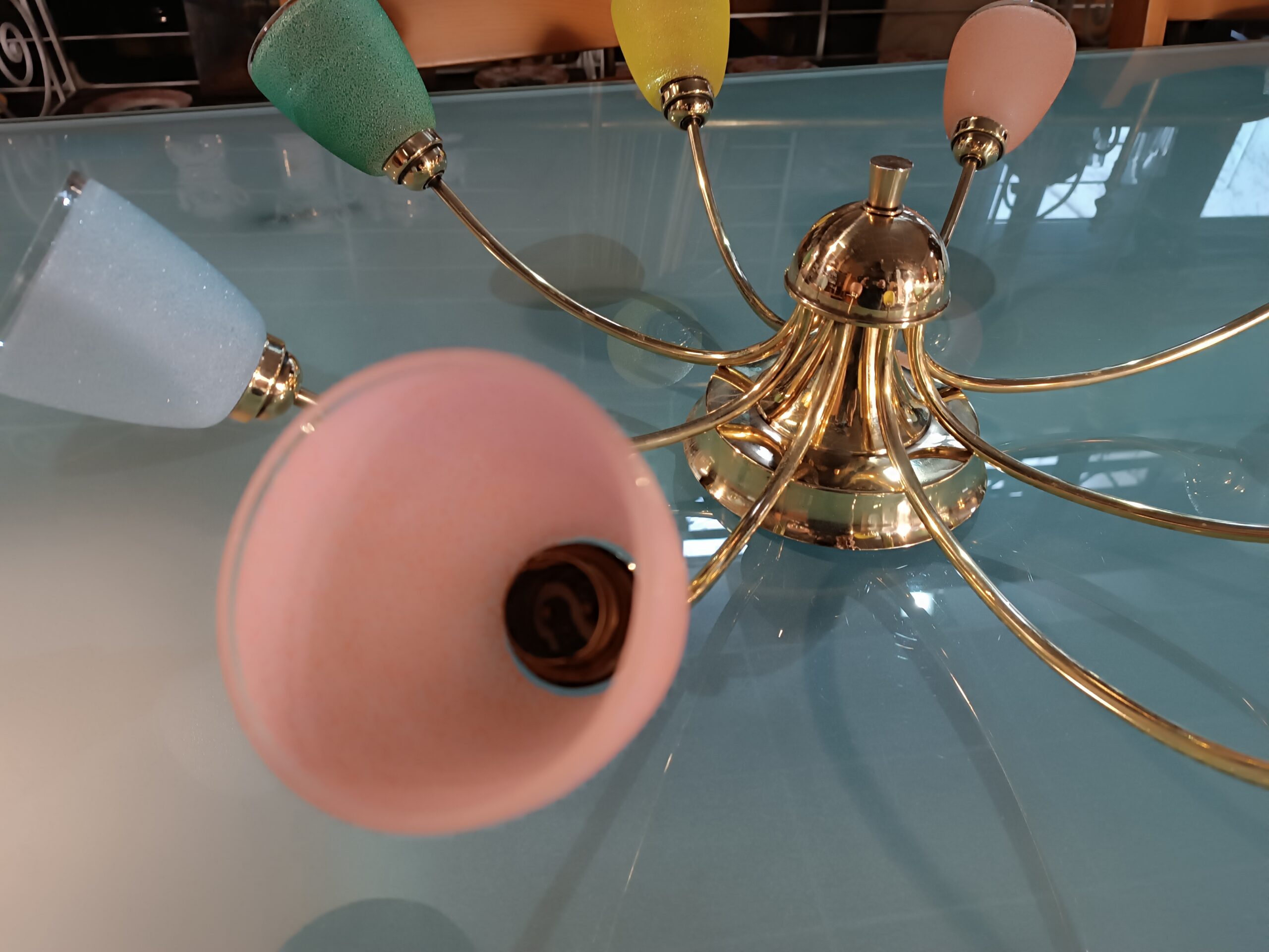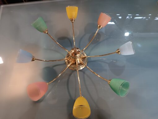 Antiquaire Objets Mobilier Antiquités Brocante Toulouse Arrivage Lustre 70 Vintage à huit Tulipes de couleurs Nouveautés Brocante en ligne