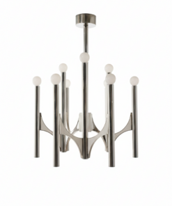 Architecture : Le lustre s’articule autour d’un axe central d’où partent des bras en forme de « ponts » ou d’arcs stylisés au profil plat. Ces bras soutiennent des cylindres verticaux (tubes) de différentes hauteurs.