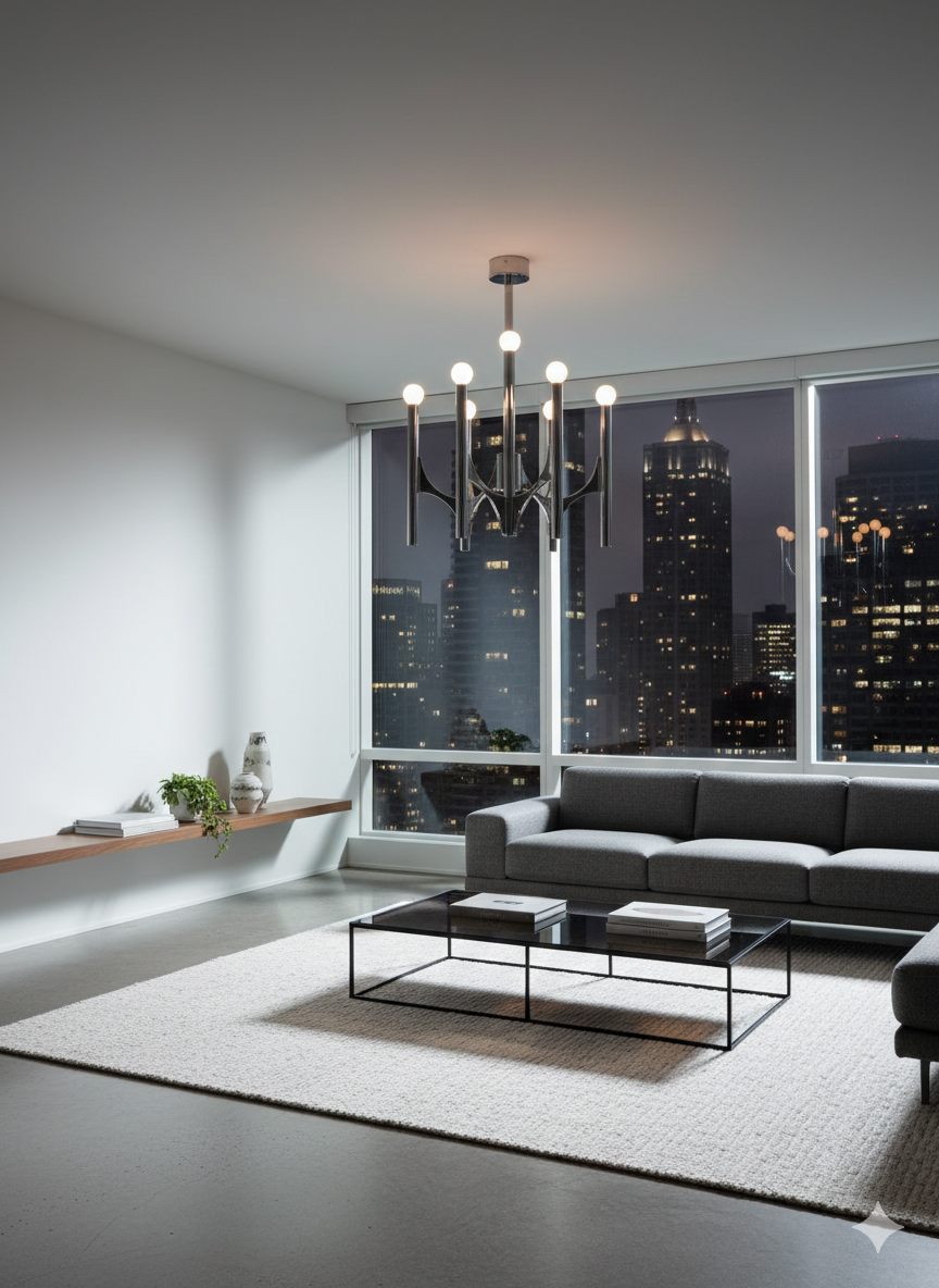 Ampoules : Il est conçu pour accueillir des ampoules « globe » (souvent à calotte chromée ou opaline blanche, comme ici) qui viennent prolonger parfaitement la ligne des tubes, transformant l’ampoule en un élément architectural à part entière.