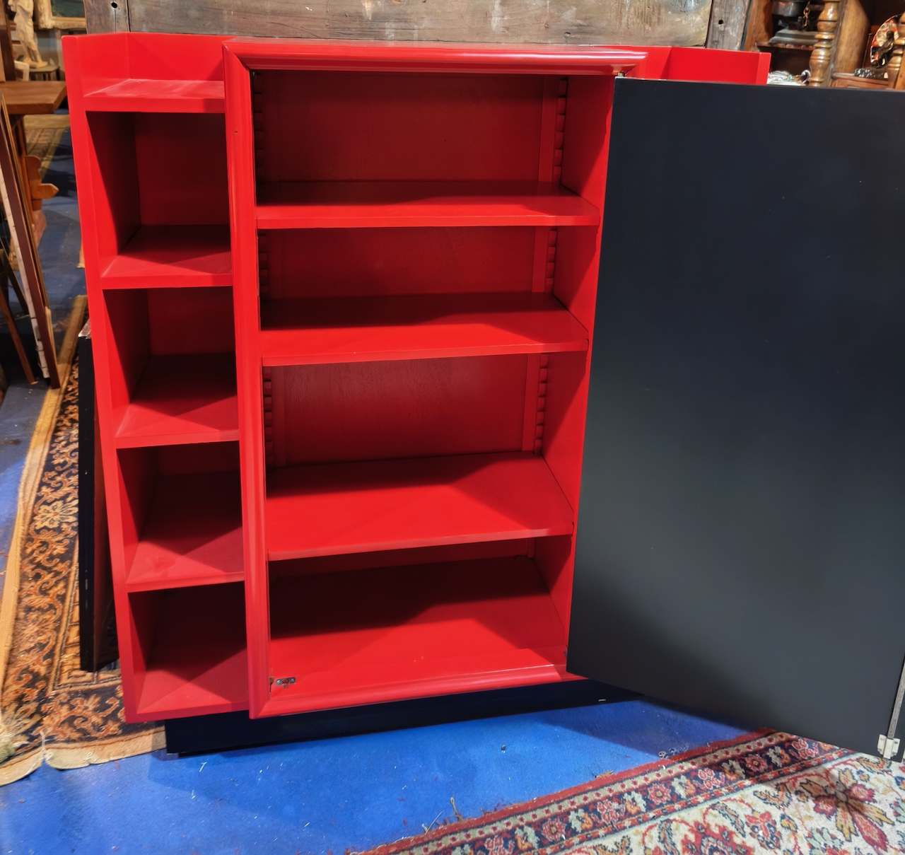 Les dix compartiments ouverts (cinq de chaque côté) permettent d’exposer des objets d’art, des livres ou des bibelots, renforçant le côté décoratif de la pièce.
