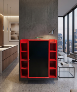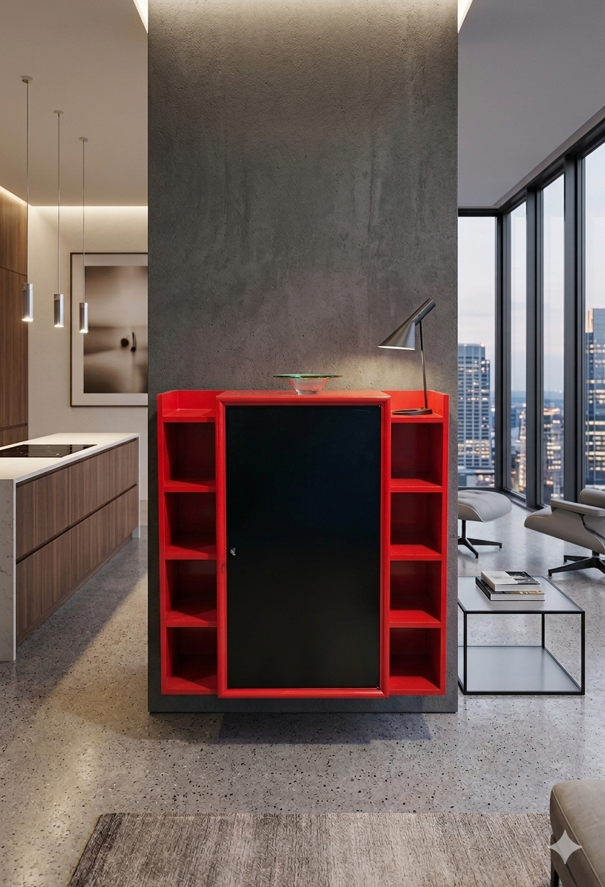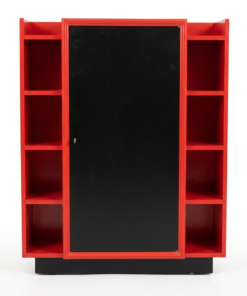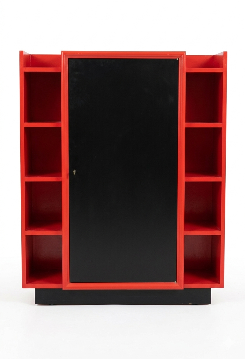 Structure Géométrique : Le meuble joue sur une symétrie verticale. La partie centrale, massive et sombre, est encadrée par deux colonnes d’étagères ouvertes, créant un équilibre entre le « plein » (le placard fermé) et le « vide » (les niches latérales).