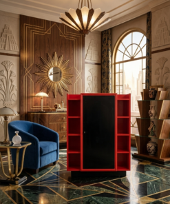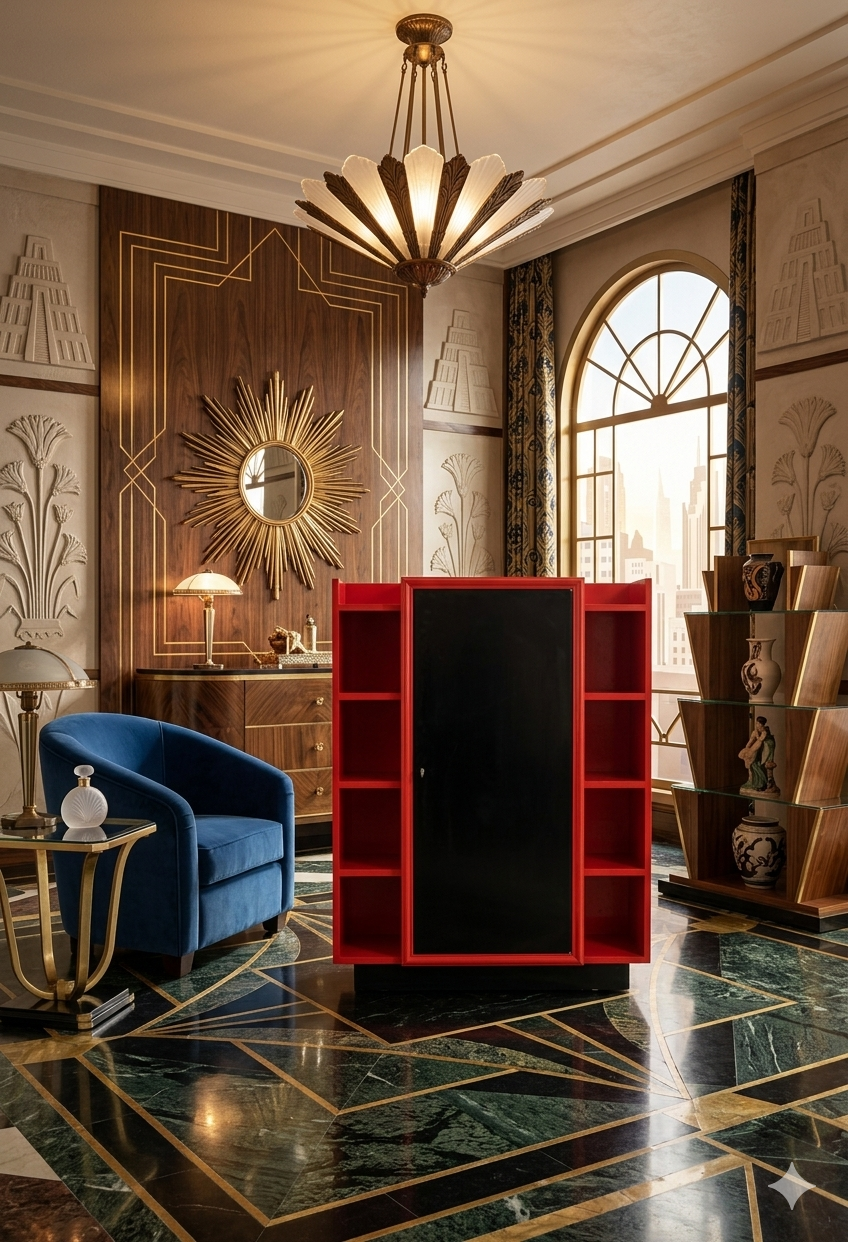 Palette de Couleurs : L’utilisation du rouge laqué et du noir profond est emblématique des années 1920 et 1930. Ce contraste radical évoque l’influence du modernisme et des arts d’Extrême-Orient (très populaires à l’époque Art Déco).