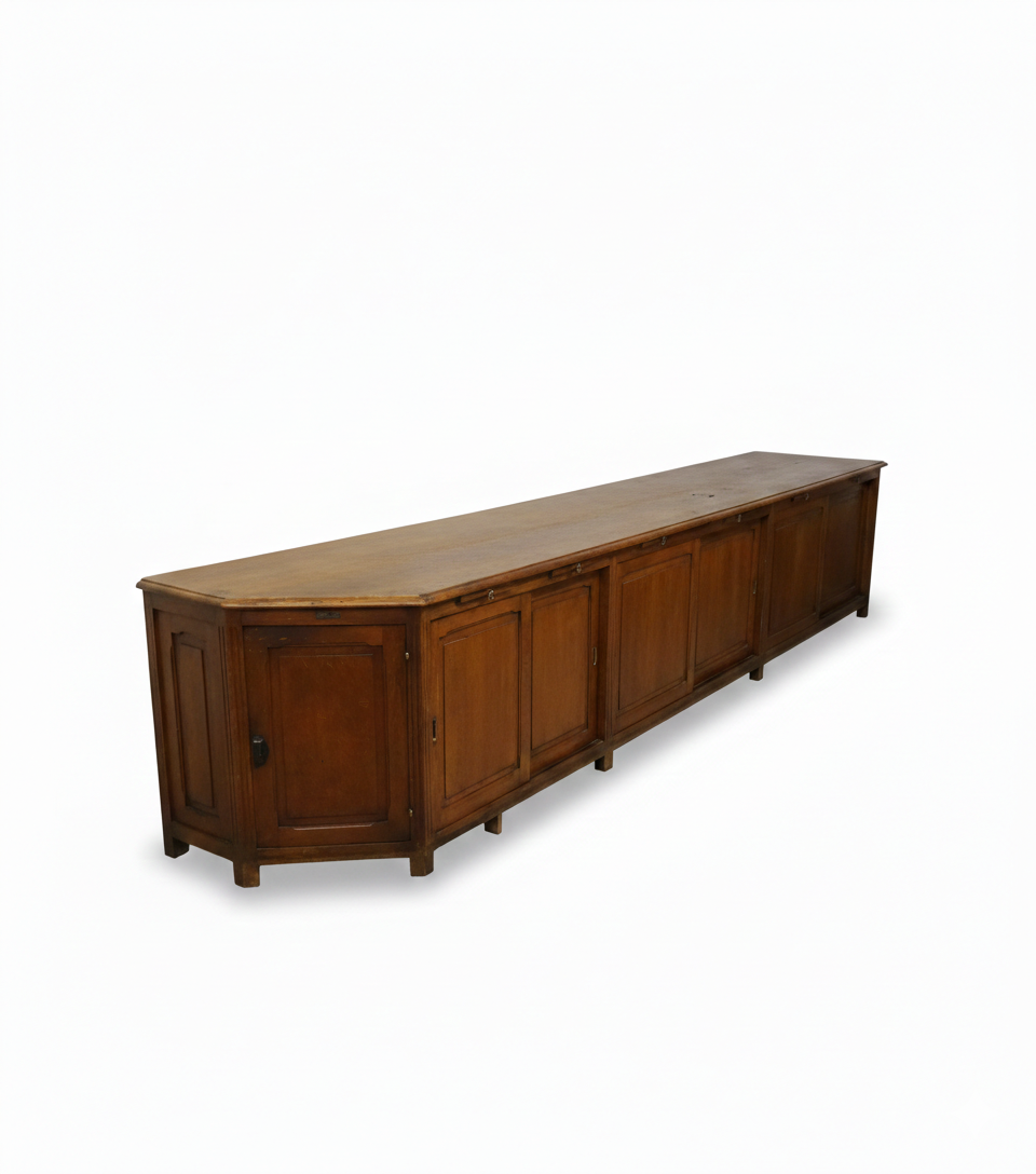 Ce meuble est une pièce imposante et pleine de caractère, typique du mobilier de métier ou de commerce du XIXe ou du début du XXe siècle. Sa configuration tout en longueur et sa robustesse suggèrent qu’il servait autrefois de comptoir de service ou de meuble de rangement pour une officine ou une mercerie.