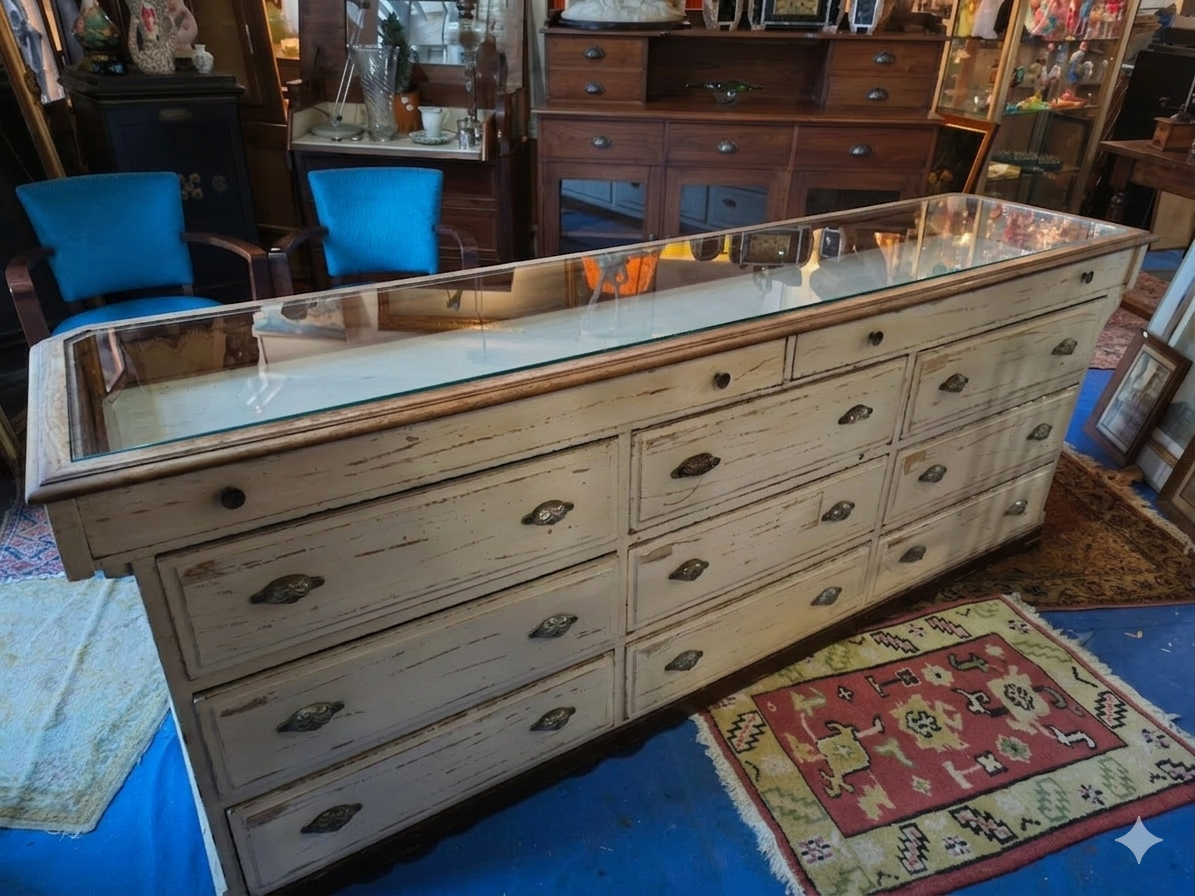 Ce type de meuble était la pièce maîtresse des anciennes boutiques de tissus, de rubans ou de mercerie. Contrairement à une commode classique, il est conçu pour être multifonctionnel : il sert à la fois de surface de présentation et de stockage massif.