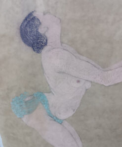 Technique : Le pastel offre ici une douceur de trait caractéristique. Alet utilise une palette restreinte mais efficace : les tons chair contrastent avec le bleu turquoise vif du drapé et le violet profond de la chevelure.