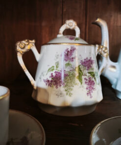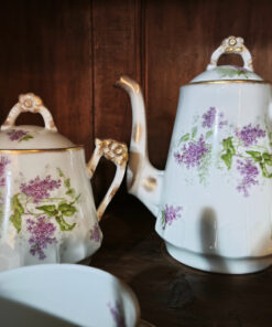 Motif Floral : Le service est orné de délicats bouquets de lilas mauves et blancs, accompagnés de leur feuillage vert. C’est un motif classique de la porcelaine de cette époque, évoquant la fraîcheur et la nature.
