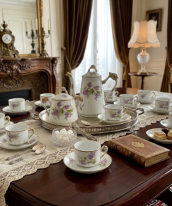 Ce service à café en porcelaine est un très bel ensemble de style romantique, probablement datant de la fin du XIXe ou du début du XXe siècle. Il se distingue par sa finesse et son décor printanier.