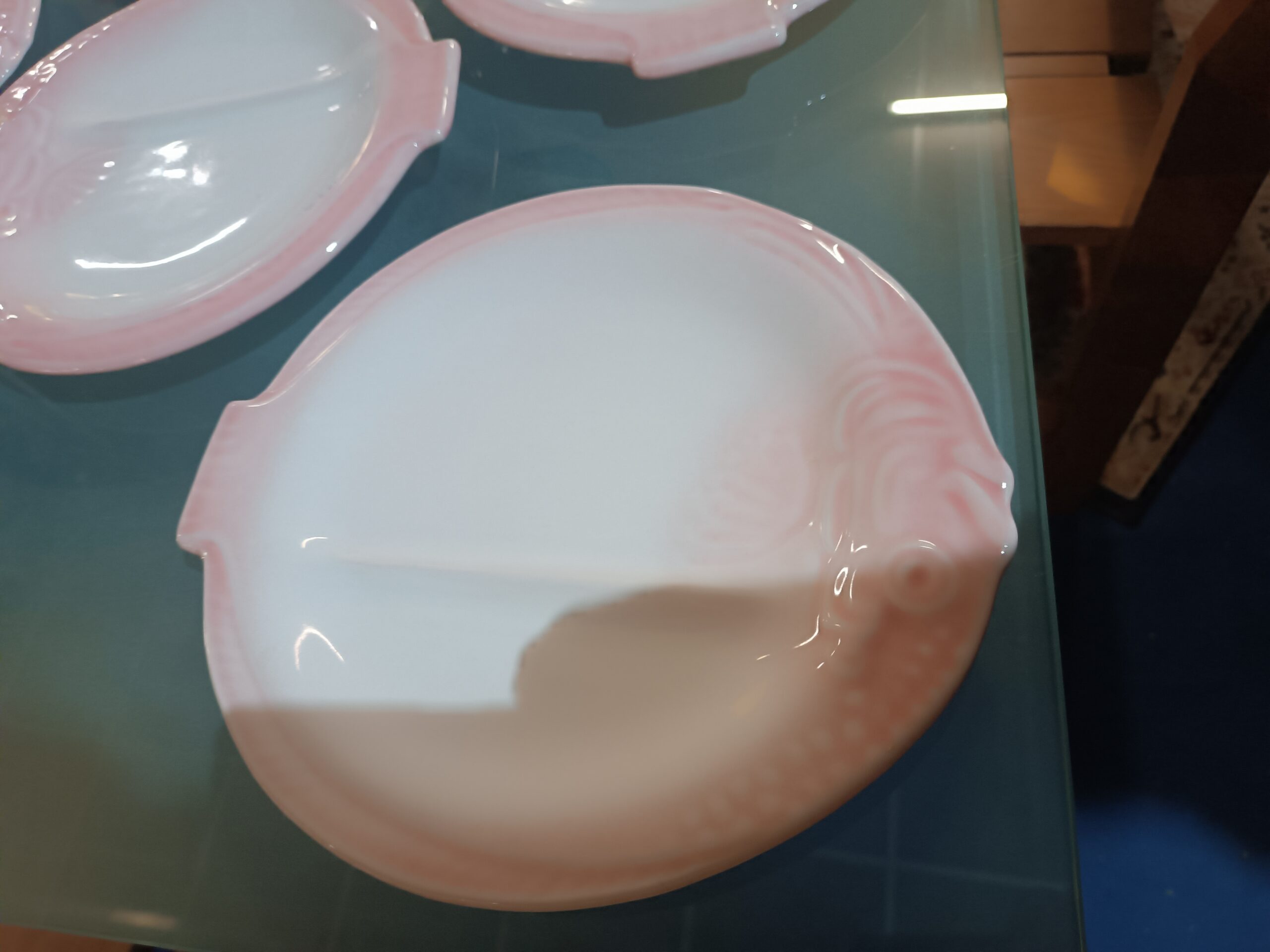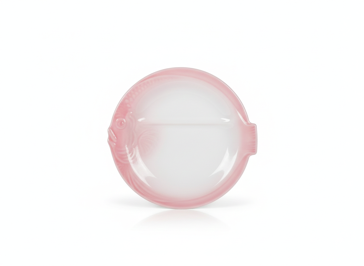 Faïence avec un dégradé de couleur rose sur les bords, ce qui lui donne un aspect nacré et très doux.