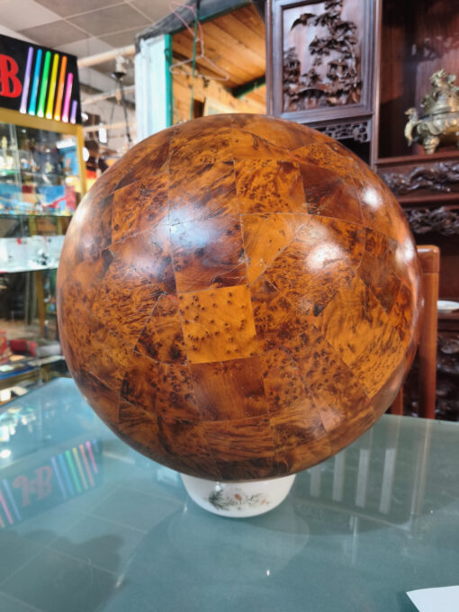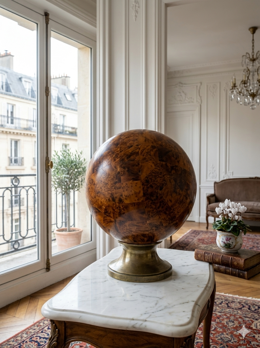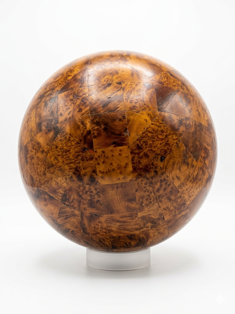 Assemblage en Marqueterie : Contrairement à une sphère sculptée dans un seul bloc massif, celle-ci est réalisée selon une technique de marqueterie bombée. On distingue de petites facettes ou sections de placage soigneusement ajustées pour épouser la forme sphérique.