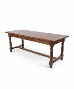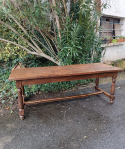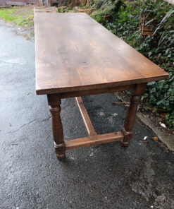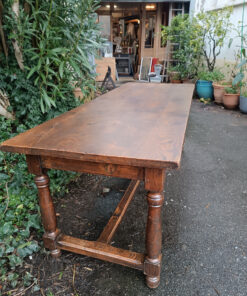 Très belle pièce ! Cette table est un grand classique du mobilier rustique, souvent appelée table de ferme ou table de monastère en raison de son piétement spécifique.