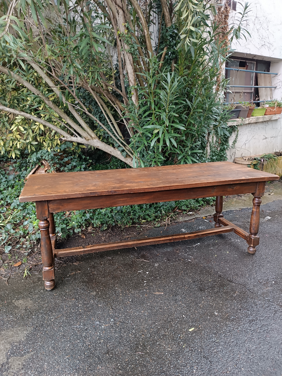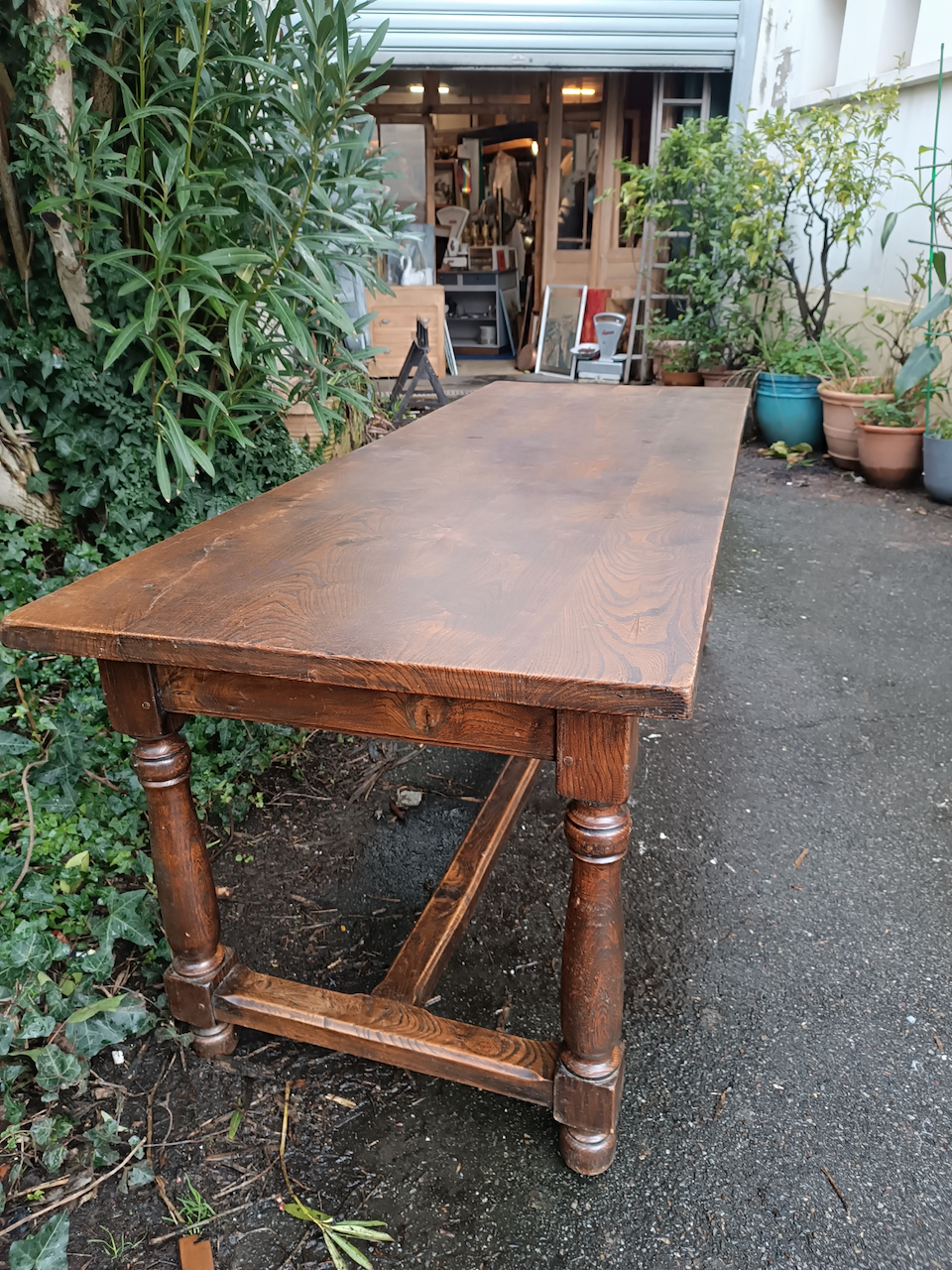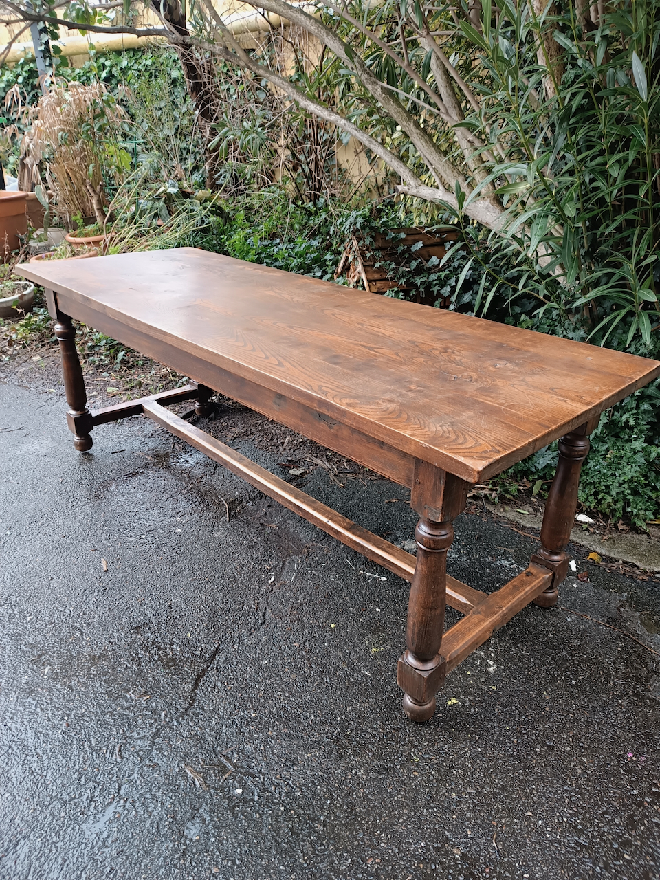Très belle pièce ! Cette table est un grand classique du mobilier rustique, souvent appelée table de ferme ou table de monastère en raison de son piétement spécifique.