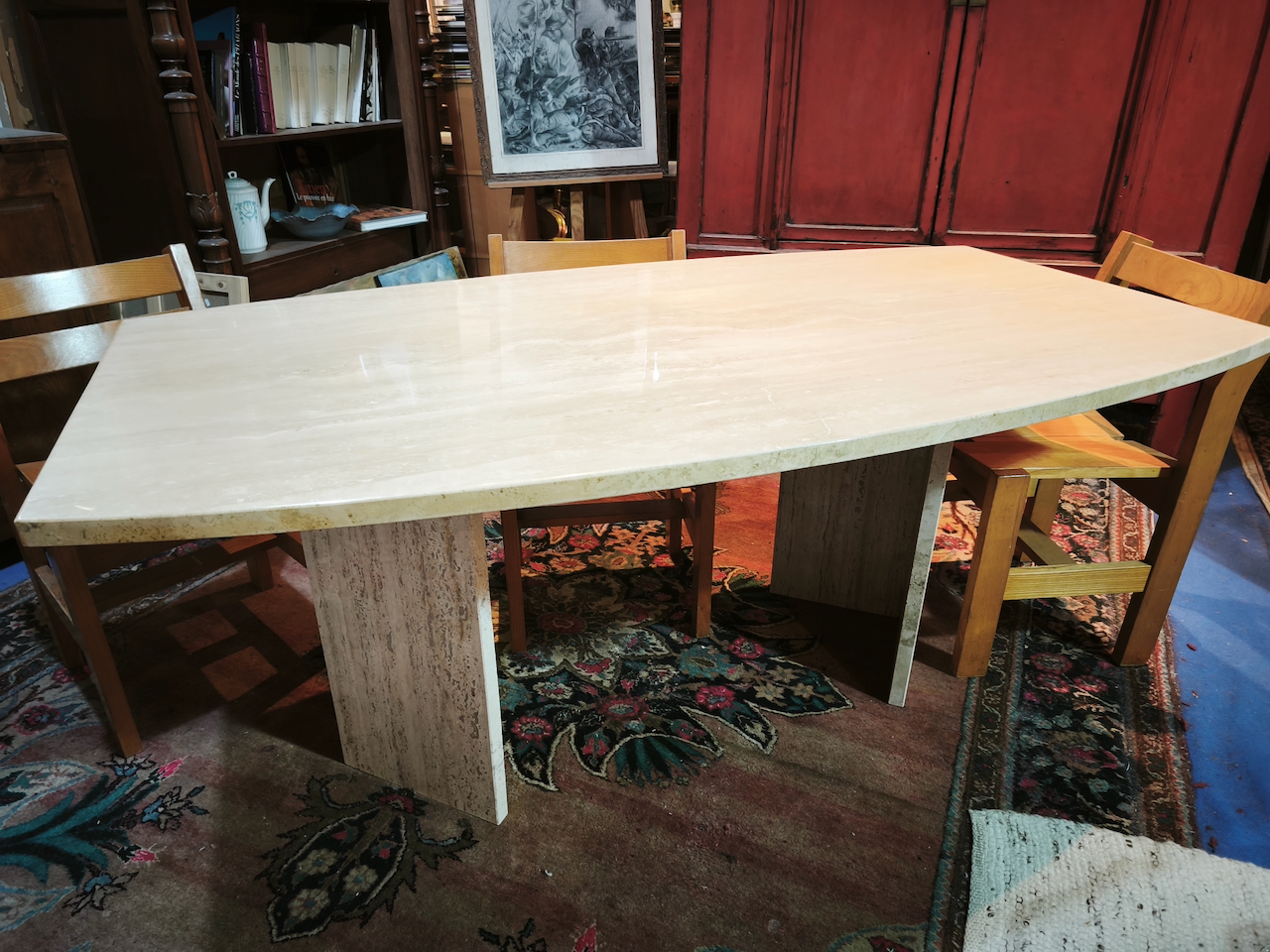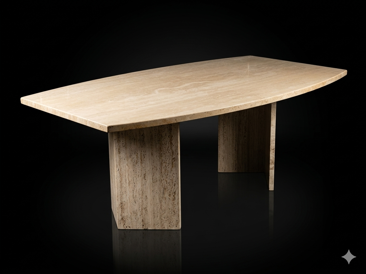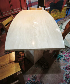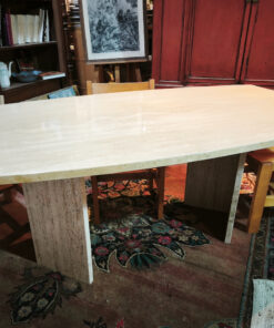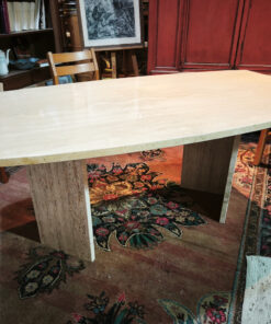 Le travertin étant une pierre poreuse, ces tables étaient souvent finies avec un mastic transparent (résine) pour boucher les trous du plateau et faciliter l’entretien, tout en gardant l’aspect « pierre » sur les tranches et le pied.