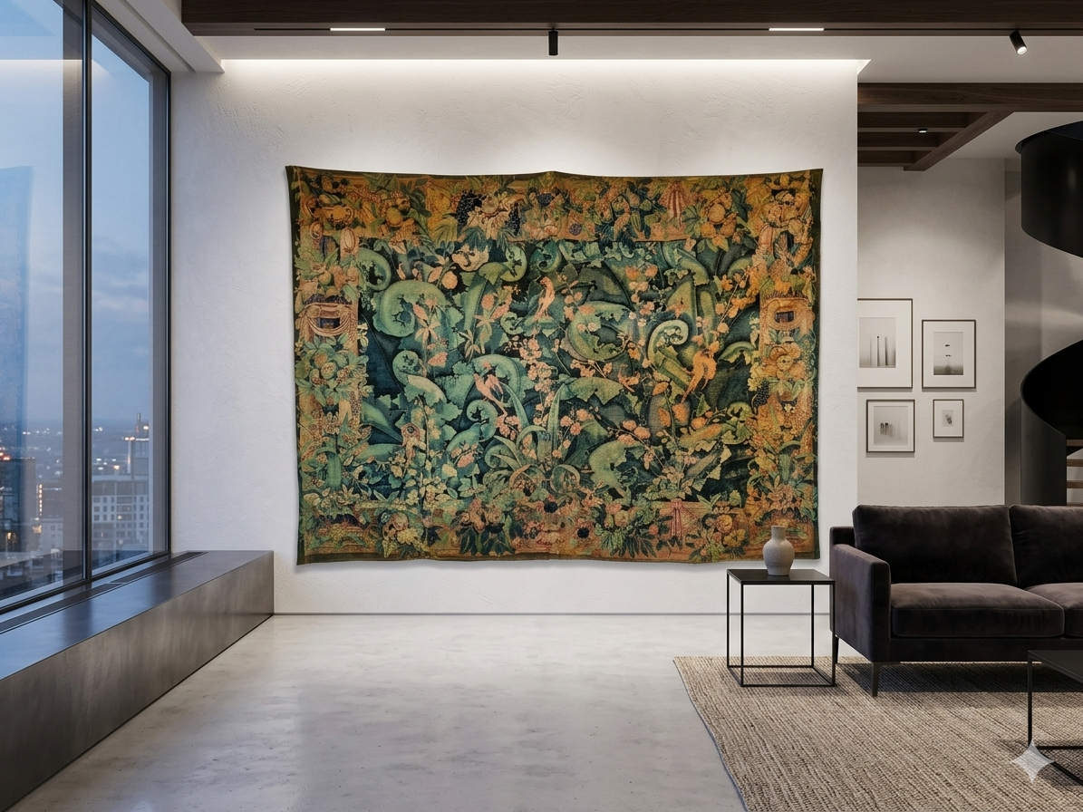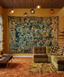 « Verdure à grands ramages » est une tapisserie d’art éditée par la prestigieuse manufacture Rambouillet. Elle s’inscrit dans la grande tradition des tapisseries de verdures, un genre très populaire en Europe dès la Renaissance. Le carton de cette pièce a été dessiné par André Demay, un artiste reconnu pour ses créations textiles et ses motifs naturalistes.