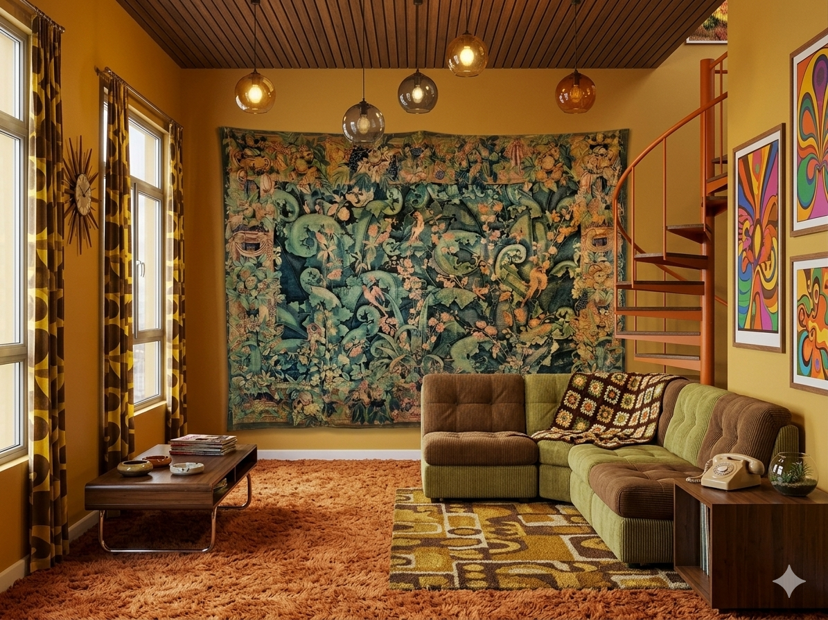 Tapisserie Rambouillet « Verdure à grands ramages » créée par André Demay, que l’on retrouve dans le décor vintage des années 1970 :