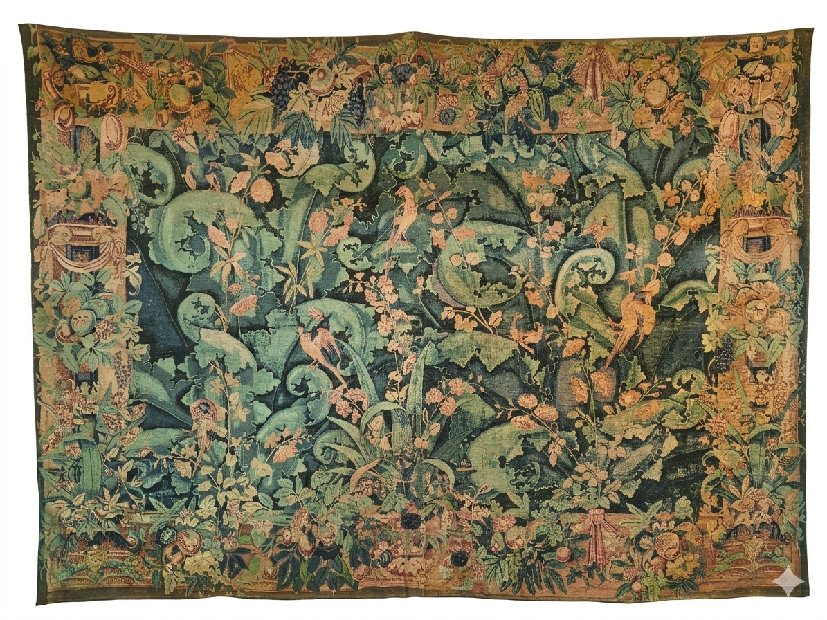 Une palette de couleurs profondes : La tapisserie utilise une gamme de verts intenses (du vert sapin au vert émeraude), des bleus profonds, et des touches de jaunes et de crèmes pour rehausser les détails et créer du contraste.
