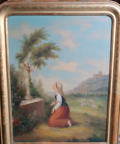 Sujet : Une jeune femme, probablement une bergère (on devine des moutons à l’arrière-plan), est agenouillée en prière devant un calvaire ou une stèle ornée d’une croix.