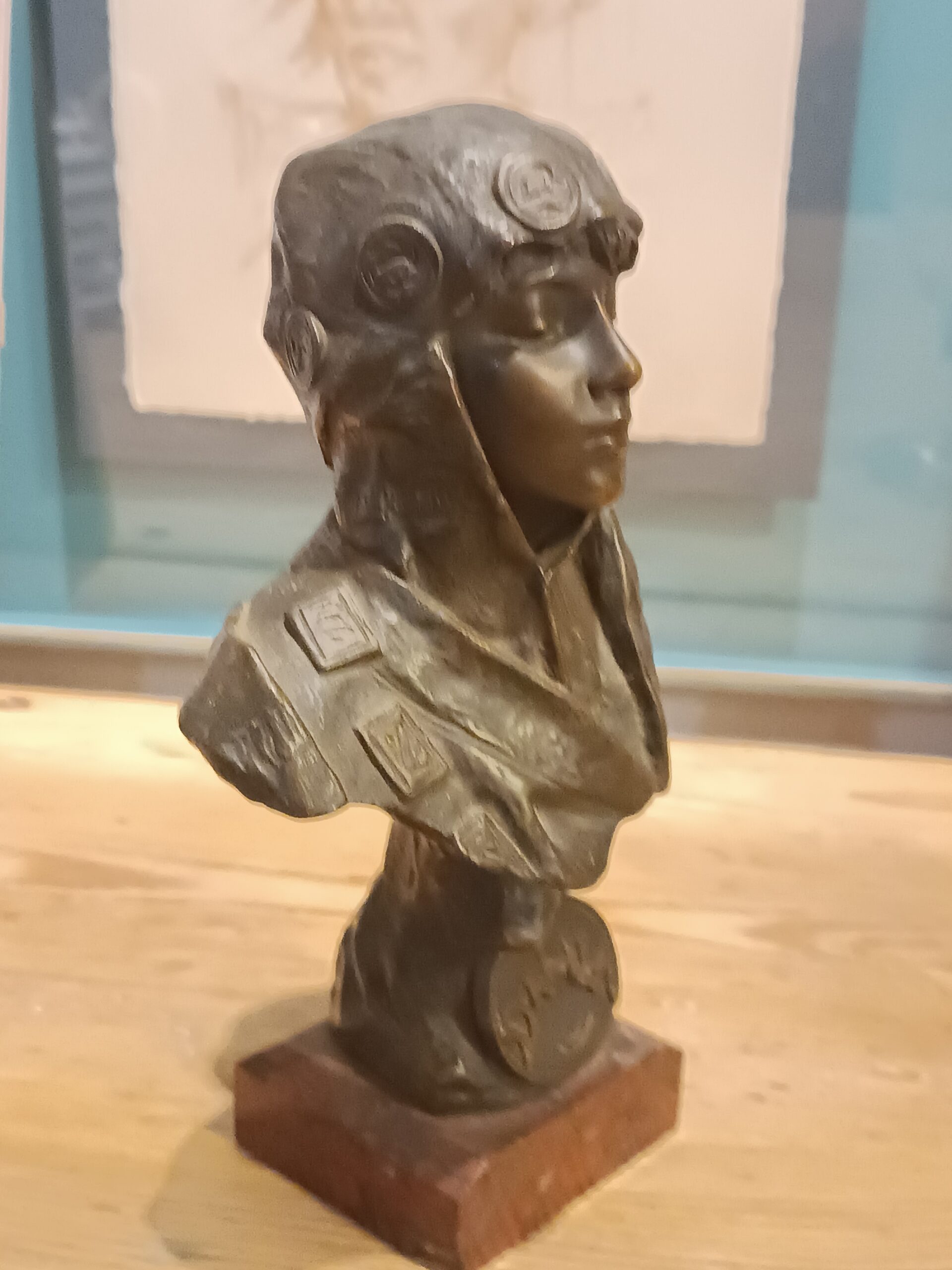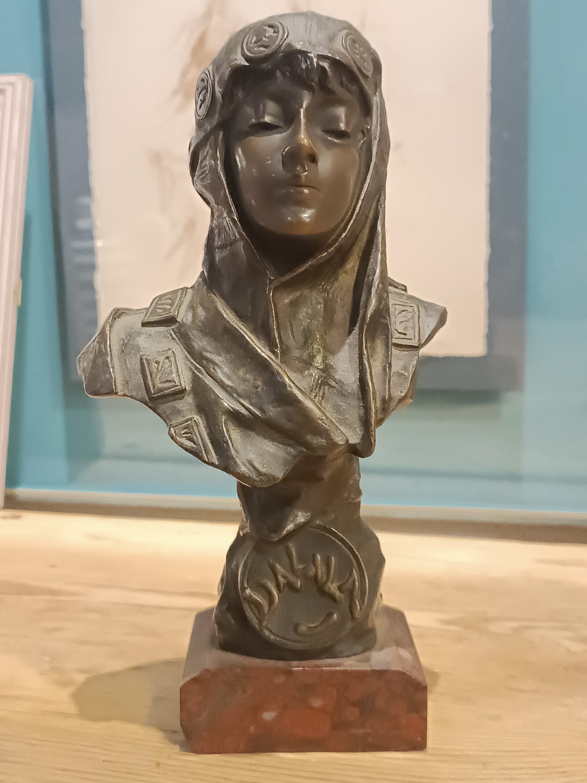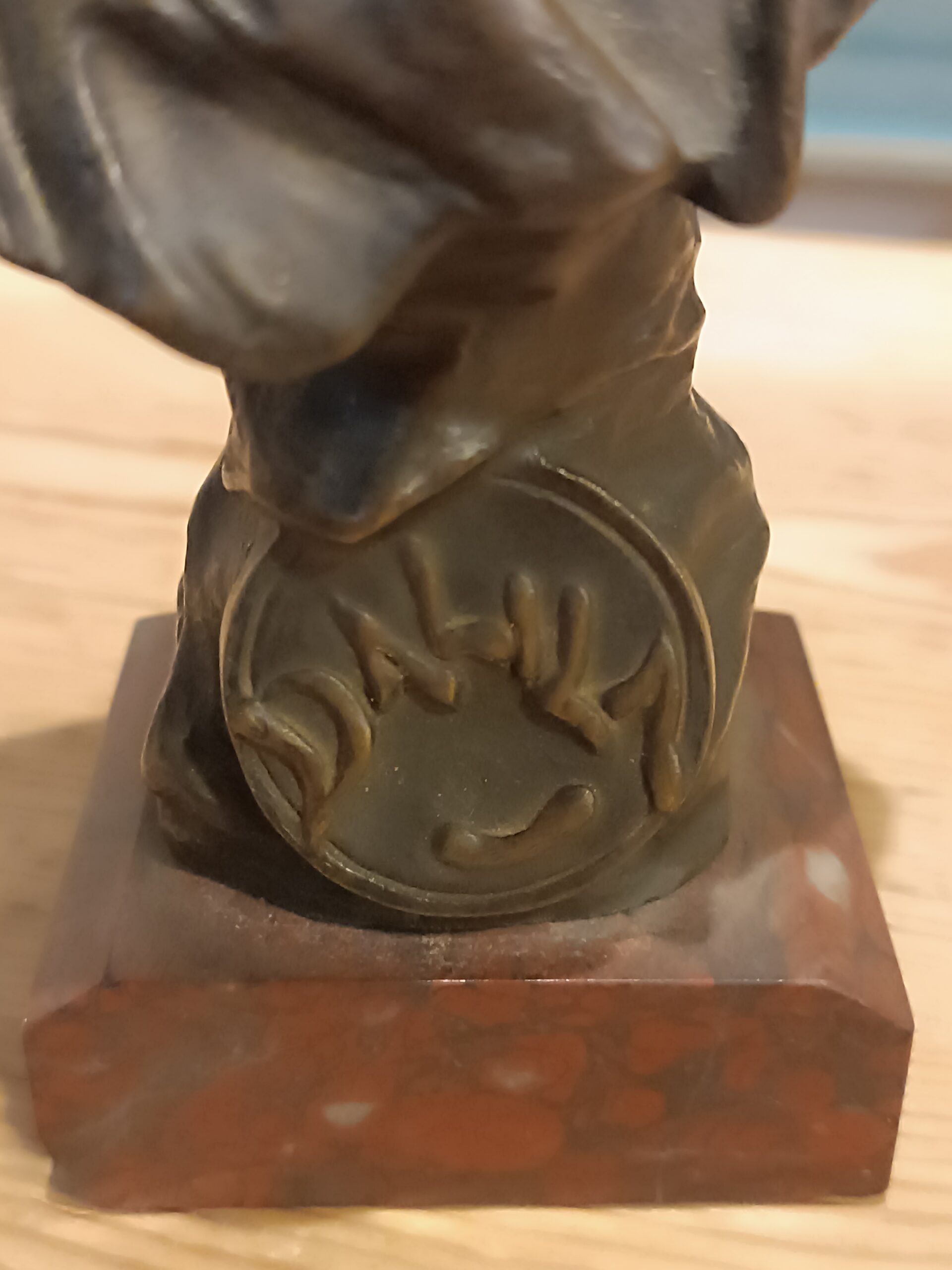 - Sur un socle en marbre rouge veiné.