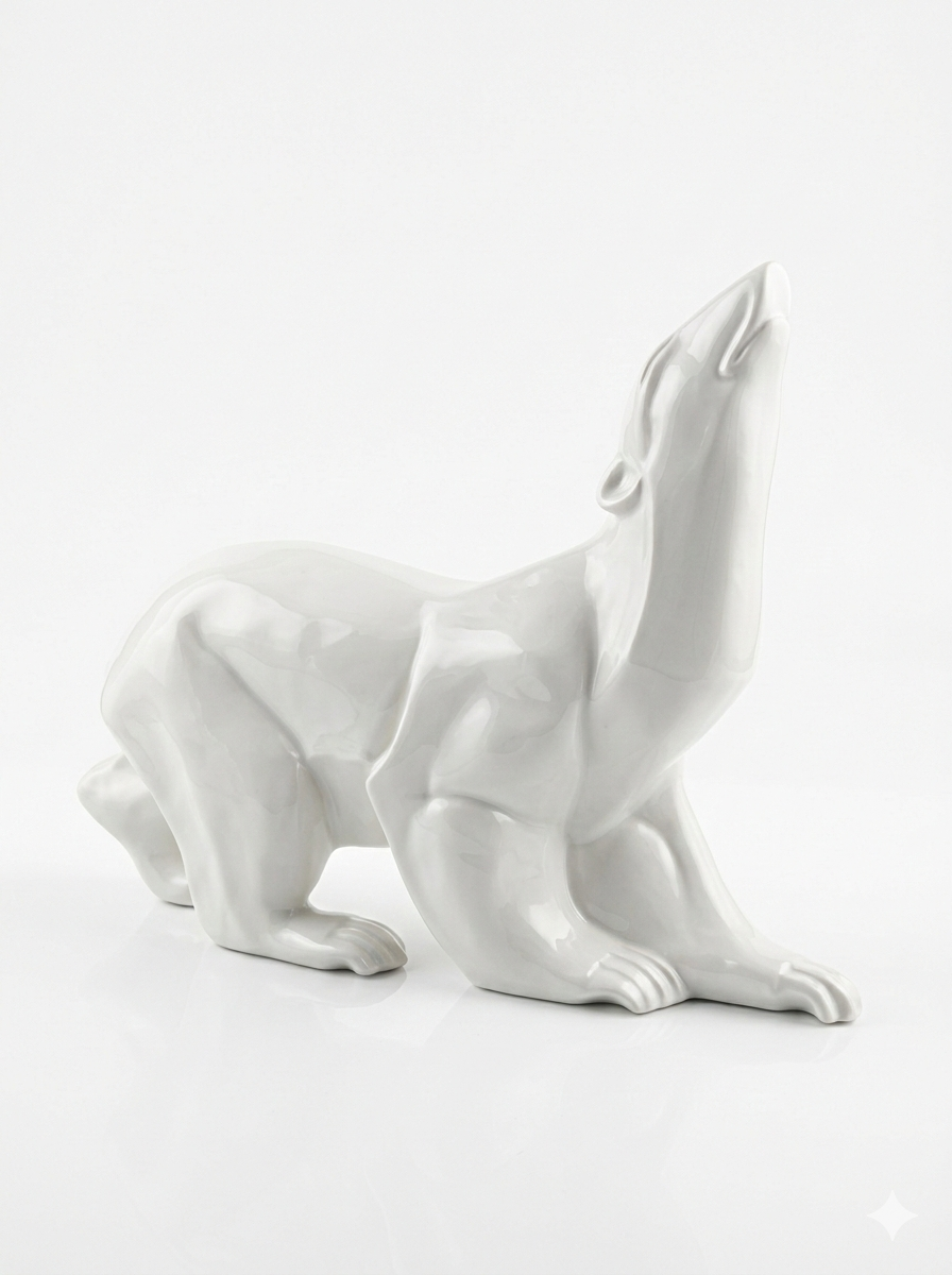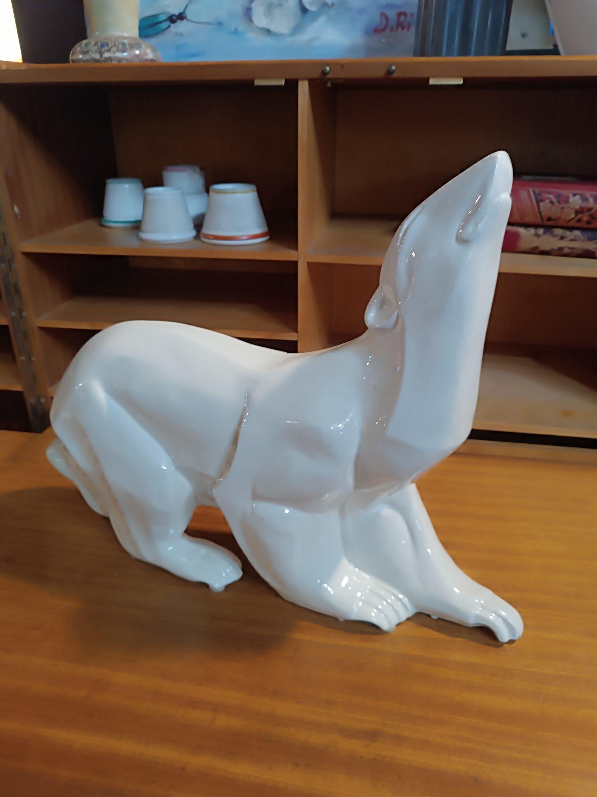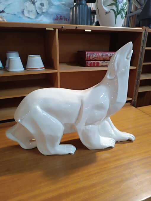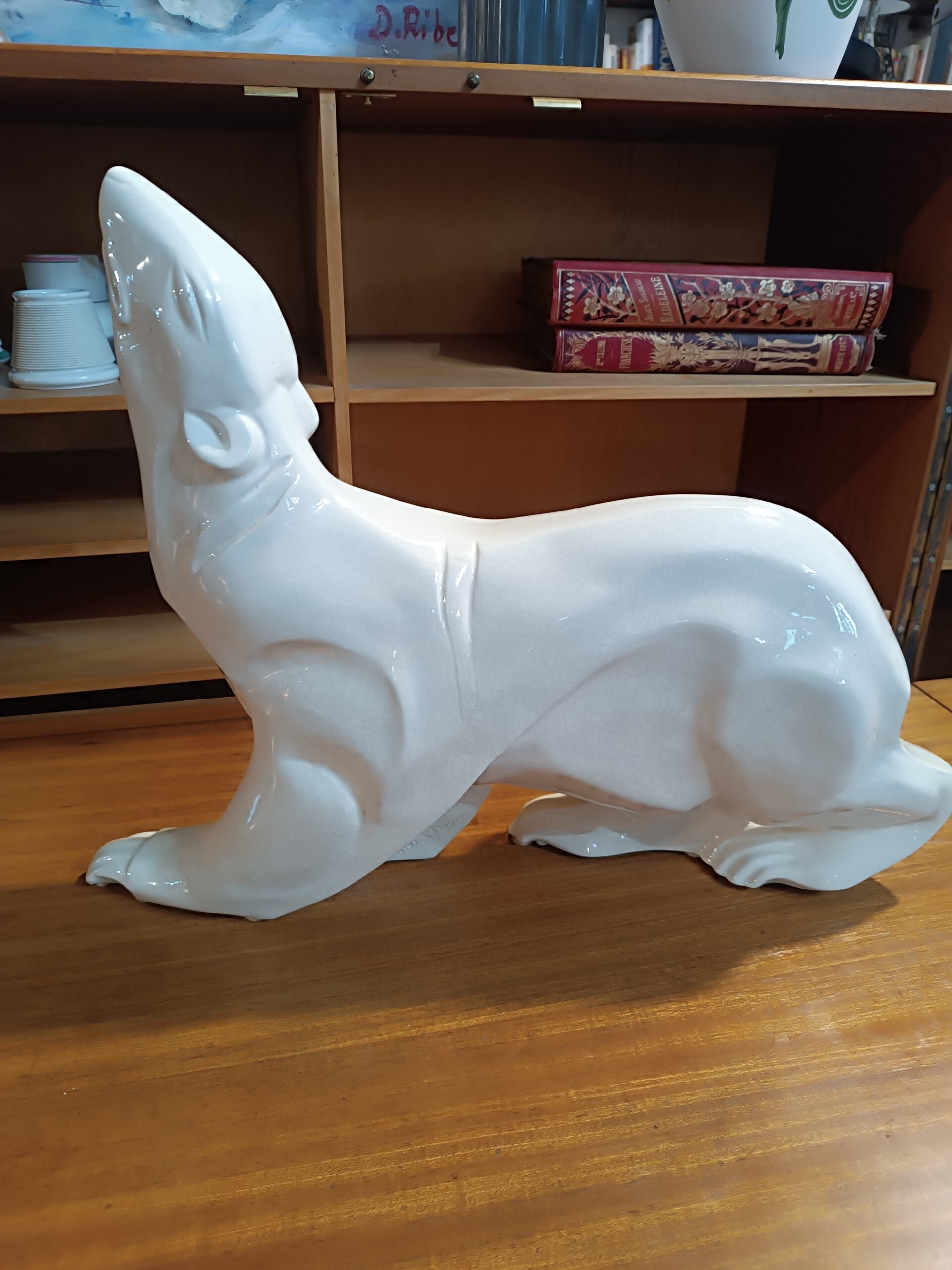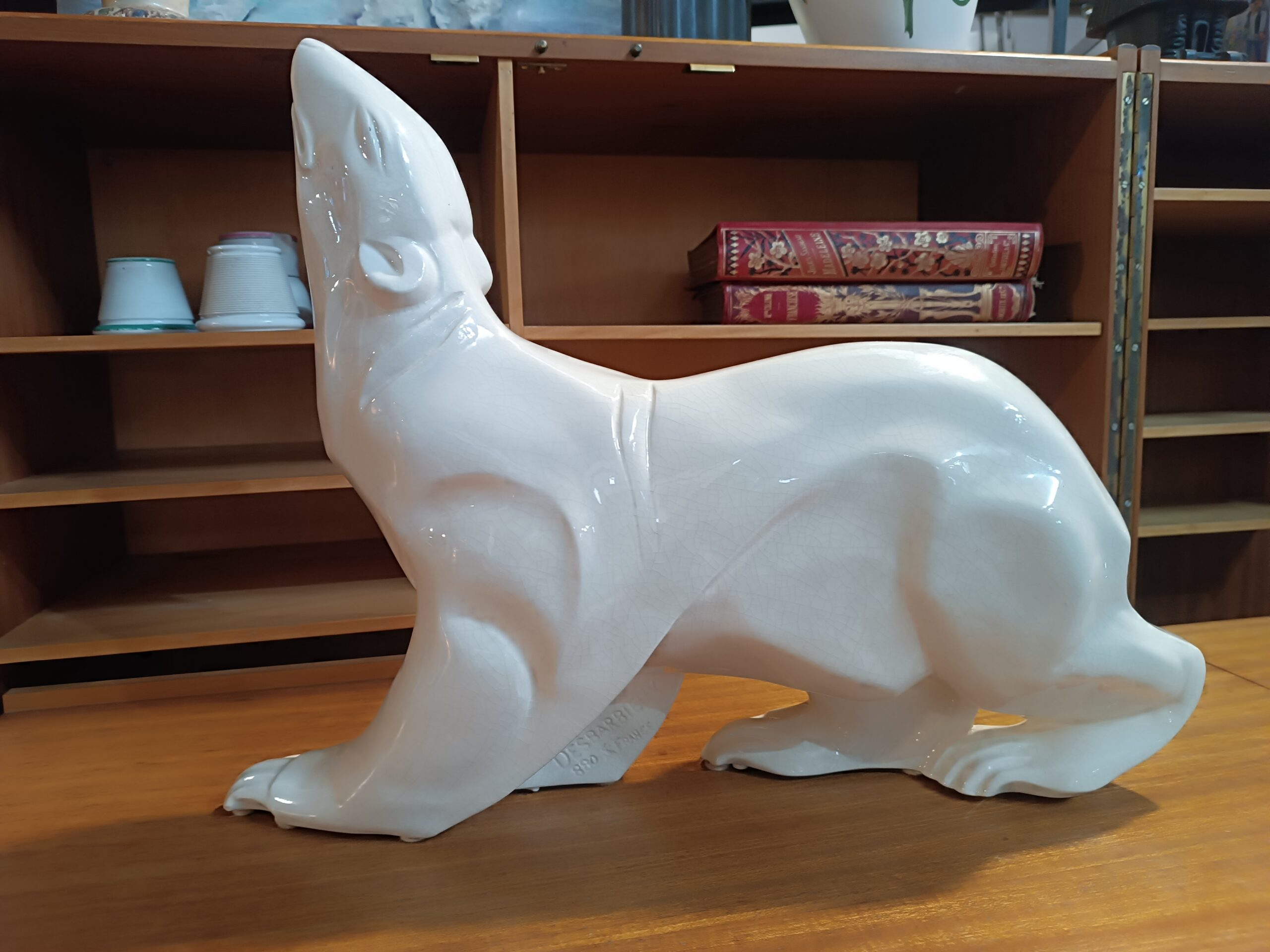 Céramique française de l’époque Art Déco. Il s’agit d’une sculpture animalière représentant un ours blanc (souvent appelé « Ours polaire »), réalisée par la manufacture Desbarbieux.