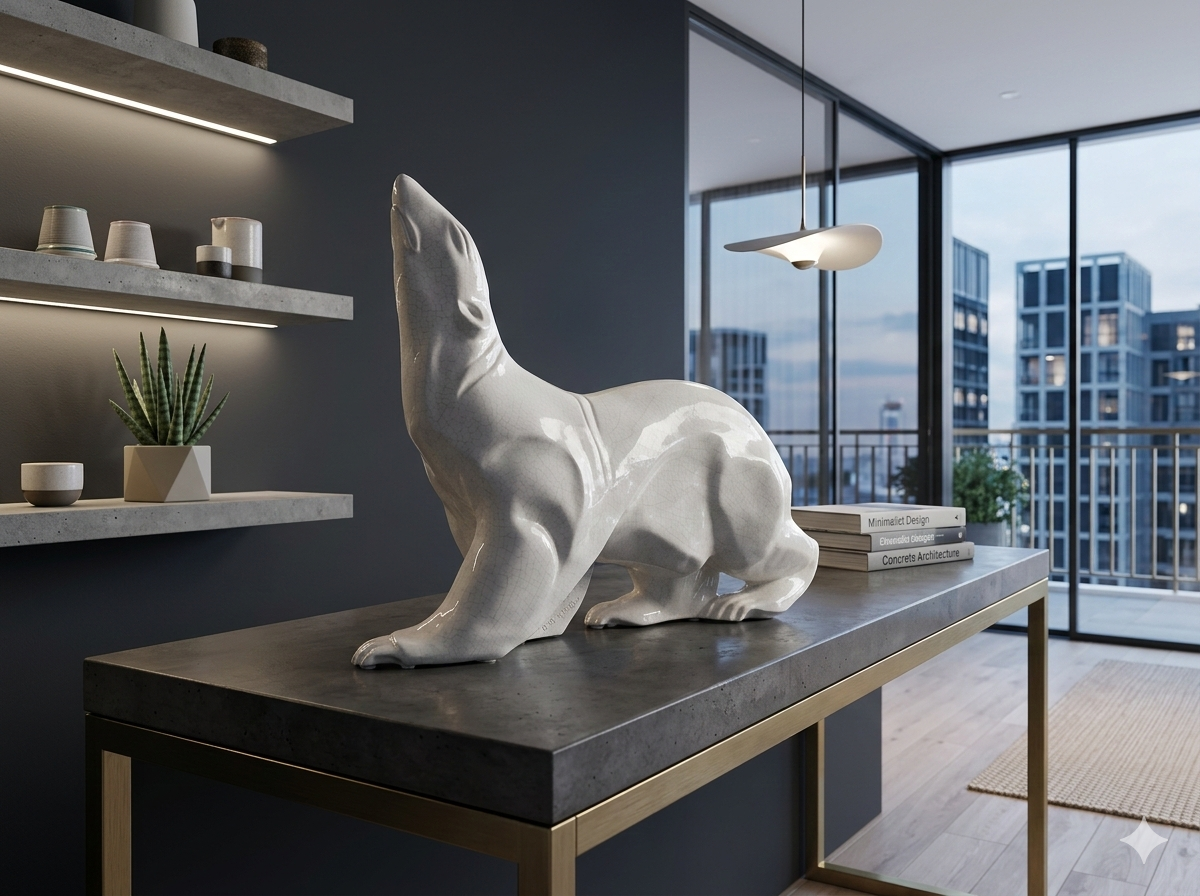 Finition : La blancheur immaculée rappelle bien sûr la banquise, mais permet aussi de mettre en valeur les jeux d’ombre et de lumière sur les muscles stylisés de l’animal.